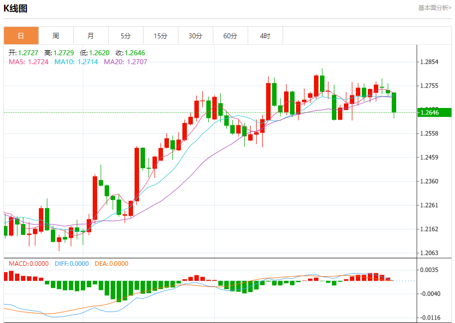 周二欧市盘中,英镑兑美元交投于1.2648,跌幅为0.62%。