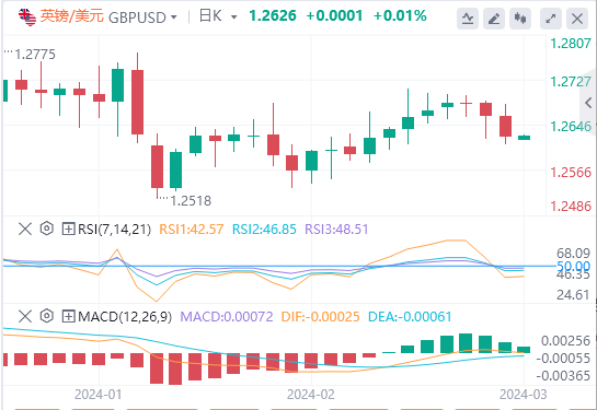 技术面上,汇价上行的初步阻力位于1.2667,进一步阻力位于1.2709,关键阻力位于1.2736;汇价下行的初步支撑位于1.2598,进一步支撑位于1.2571,更关键支撑位于1.2529。