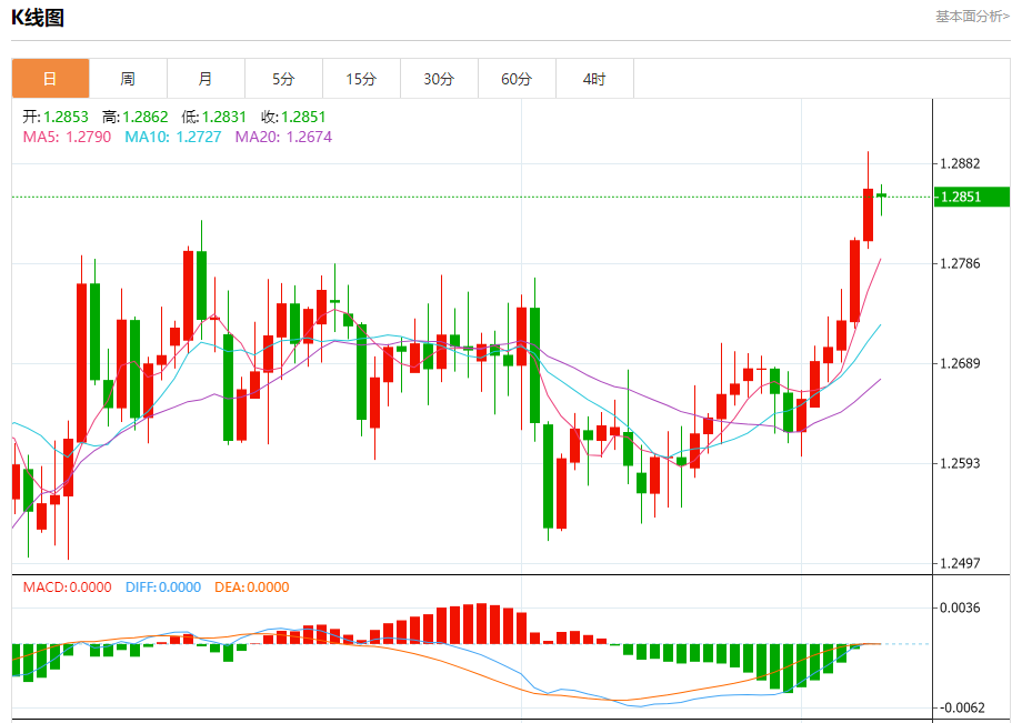 周一欧市盘中,英镑兑美元交投于1.2851,跌幅为0.02%。