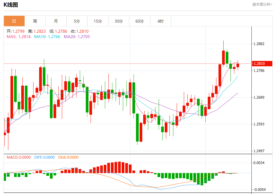 周四欧市盘中,英镑兑美元交投于1.2809,涨幅为0.08%。