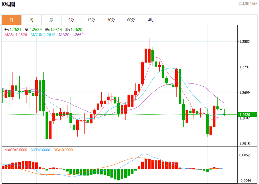 周一欧市盘中,英镑兑美元交投于1.2621,跌幅为0.13%。