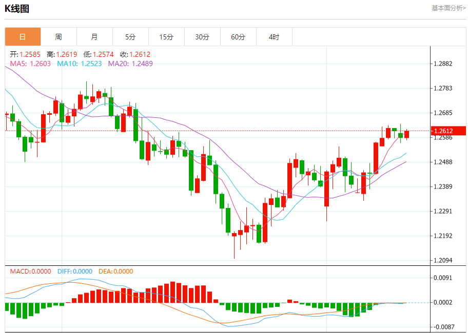 周四欧市盘中,英镑兑美元交投于1.2614,涨幅为0.22%。