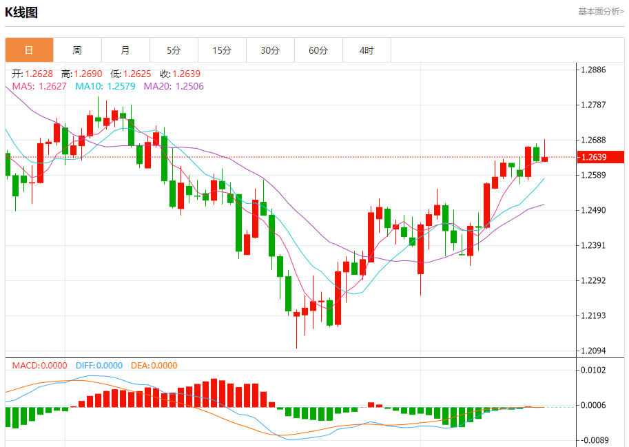 周一欧市盘中,英镑兑美元交投于1.2641,涨幅为0.08%。