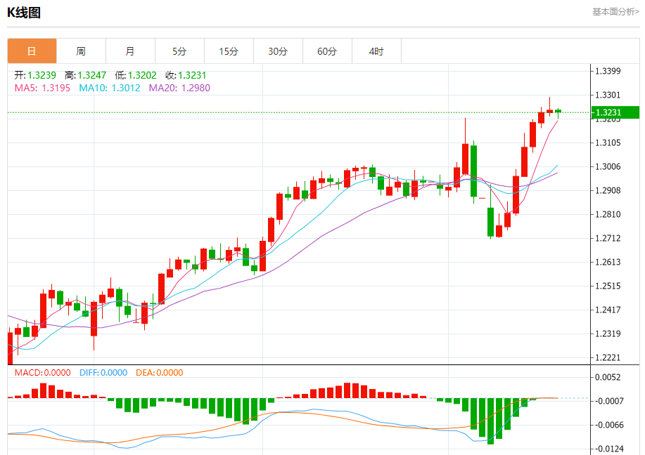 周四欧市盘中,英镑兑美元交投于1.3233,跌幅为0.06%。