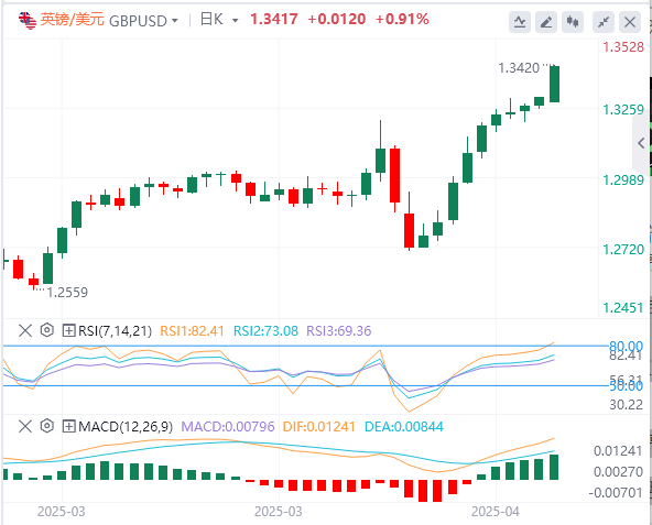 4小时图上的相对强弱指数(RSI)指标上升至80以上,指向短期内超买状态。上行方面,1.3430(静态水平,上升通道的中点)作为关键阻力位,之后是1.3500(静态水平,整数位)和1.3550(上升通道的上限)。