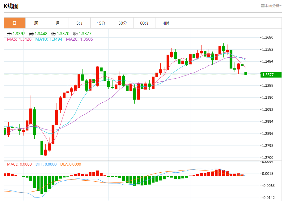 周一欧市盘中,英镑兑美元交投于1.3379,跌幅为0.54%。