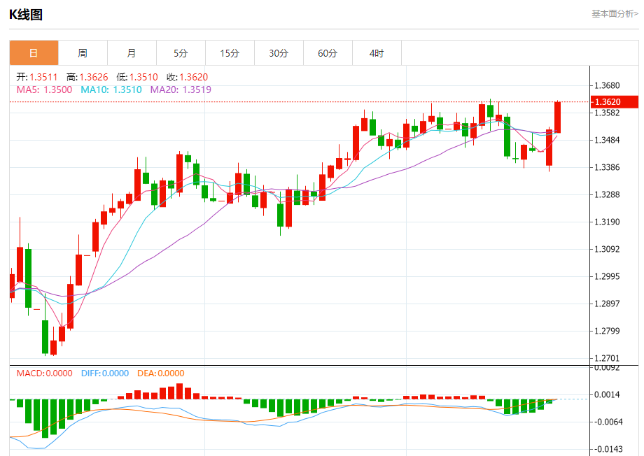 周二欧市盘中,英镑兑美元交投于1.3622,涨幅为0.74%。