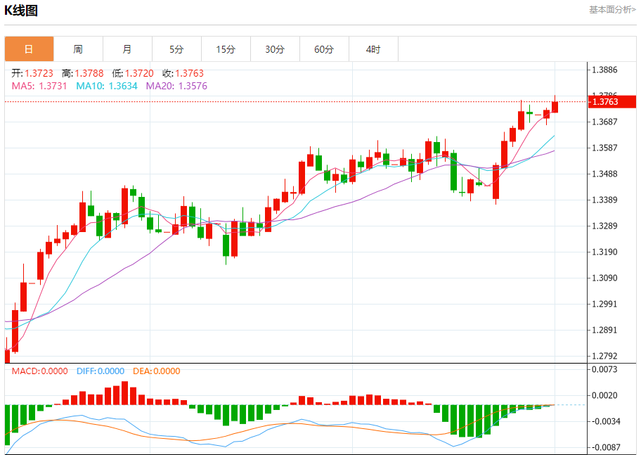 周二欧市盘中,英镑兑美元交投于1.3765,涨幅为0.24%。