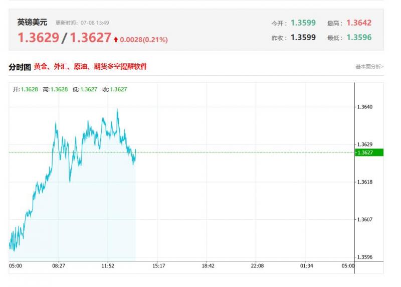 英镑兑美元今日汇率最高1.3629 ,最低1.3627 ,涨跌0.0028 ,涨跌幅0.21% 。