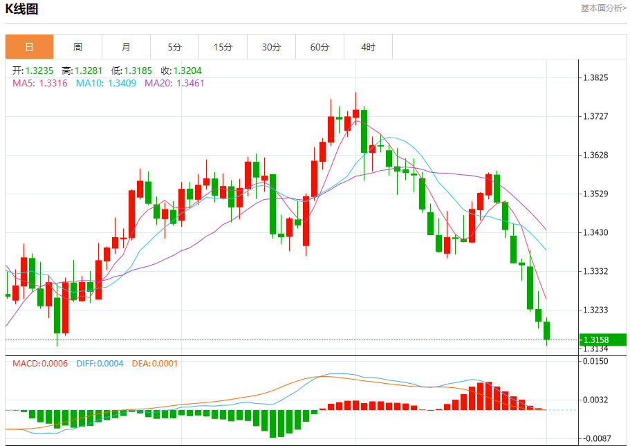 周五欧市盘中,英镑兑美元交投于1.3163,跌幅为0.33%。