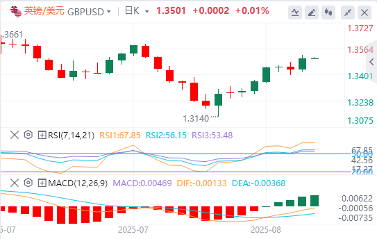 英镑周二的看涨延伸支撑英镑/美元买盘回到50附近的1.3430日指数移动平均线(EMA)上方,使盘中价格走势三周来首次回到1.3500关口上方。英镑/美元买家正在继续收复从最新波动低点的损失,但作为技术上限,进入1.3600区域的最后一个波动高点仍然在前方。