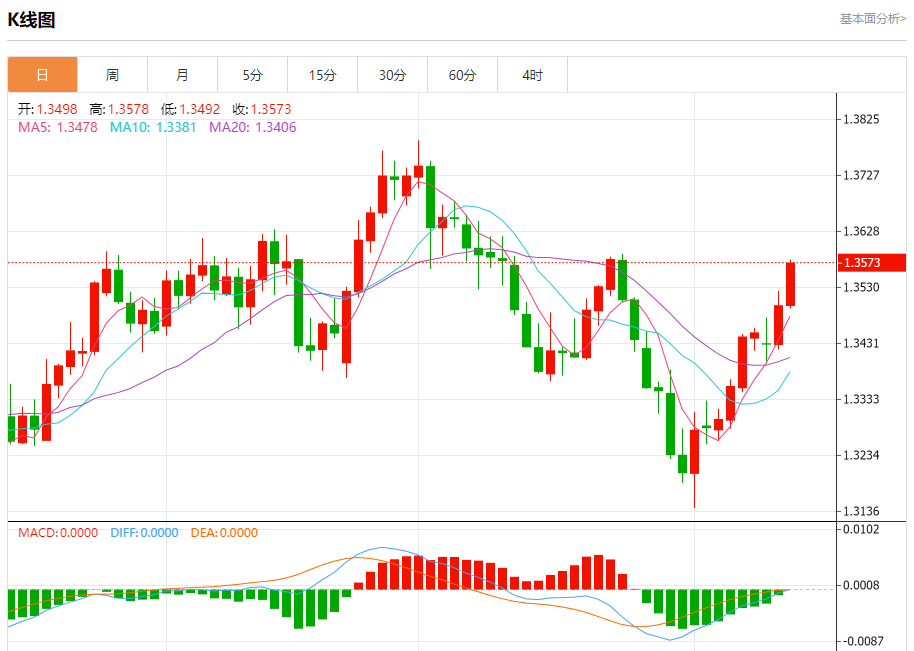 周三欧市盘中,英镑兑美元交投于1.3574,涨幅为0.56%。