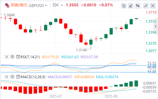 英镑/美元正在50日指数移动平均线(EMA)以北延续单边看涨势头,在过去九个交易日中除一个交易日外,其余交易日均收于持平或更高后攀升至1.3600。英镑在3.35附近的200日均线附近找到技术底部后,自下而上上涨超过1.3150%,但可能在最后一个波动高点附近耗尽看涨势头。
