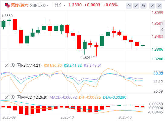在4小时图中,英镑/美元目前交投于1.3330附近,比当日开盘价1.3351低3点,日内变化不大。盘中技术基调疲软,现货保持在一组下降移动平均线下方:20周期均线位于1.3368,50周期均线位于1.3381,100周期均线位于1.3398,看跌排列使直接偏见倾斜较低。势头证实了谨慎的基调,因为14周期RSI已从43.6降至43,仍低于50中线,表明卖家保持上风,没有达到超卖区域。