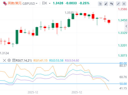 从7月初的1.3791高点到11月的1.3008低点测量,61.8%的斐波那契回撤位1.3491是下一阻力位,而50%的回撤位1.3399则为即时支撑位。日收盘价若突破1.3491将延长涨幅,回落至1.3399以下则可能引发更深回撤。