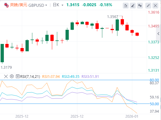 从1.3791高点测得至1.3012低点,50%斐波那契回撤位1.3402在未能守住61.8%斐波那契回撤位1.3494后,成为附近的一个枢轴。若反弹突破该阻力位,将打开通往1.3600圆水平阻力的路径。