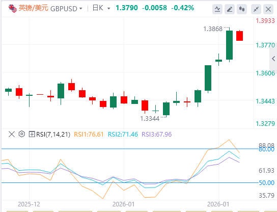 英镑/美元保持在九日指数移动平均线(EMA)和50日指数均线之上,强化了多头倾向。短期平均线上升并在中期斜率上拉大差距,表明趋势强度较强。在价格遵守上升的短期平均线时,跌幅可能会被控制,中期EMA支撑了更广泛的趋势。