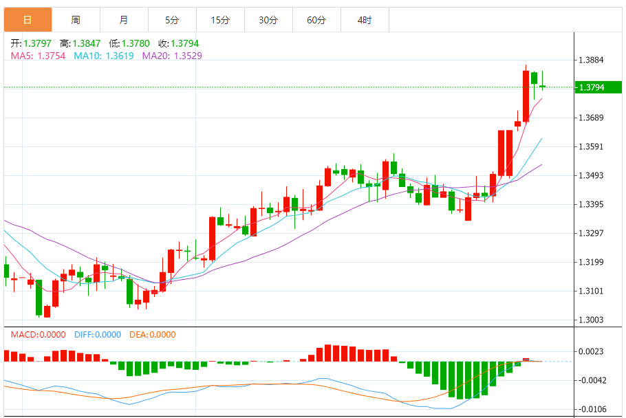 周四欧市盘中,英镑兑美元交投于1.3796,跌幅为0.07%。