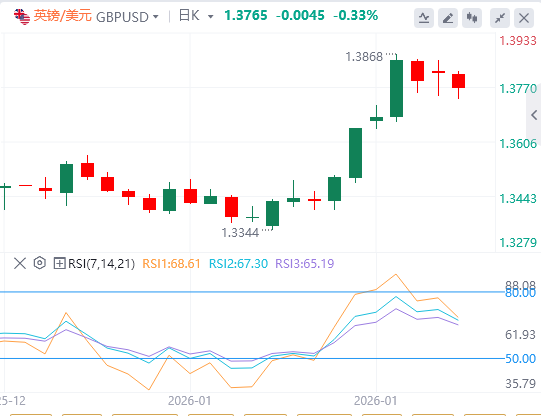 100小时简单移动平均线(SMA)呈上升趋势,英镑/美元保持在其上方,维持温和的看涨偏向。 SMA位于1.3759,提供附近的动态支撑。 移动平均收敛/发散(MACD)线位于信号线下方,接近零水平,带有小幅负直方图,表明动能减弱。 相对强弱指数(RSI)在43,仍低于中线,反映出力量疲软。