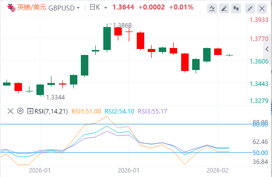 周三将迎来双重事件冲击:凌晨5:30美国劳工统计局将发布延迟的1月非农就业数据(NFP),市场预期增长7万,较12月的5万显着提升,同时包含年度基准修正、失业率(共识4.4%)和平均小时工资(环比0.3%,同比3.6%)。若实际数据低于7万,可能打压美元并推动英镑回升至1.3700-1.3727阻力区(61.8%斐波那契回撤位);若数据强劲,则可能促使汇价下探1.3510支撑位及50日均线。