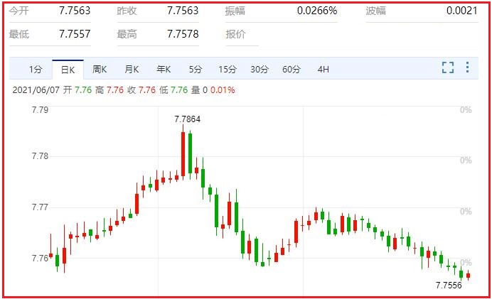 2.均线系统走势来看,MA5、MA10空头排列,MA5、MA10向下运行态势。MA60、MA100、MA200多头排列,汇价受MA200支撑。市场交投气氛整体偏多;MACD指标显示空头状态,绿柱扩张限制。综合看来,美元对港元汇率看涨。( 亚汇网编辑:竣生)