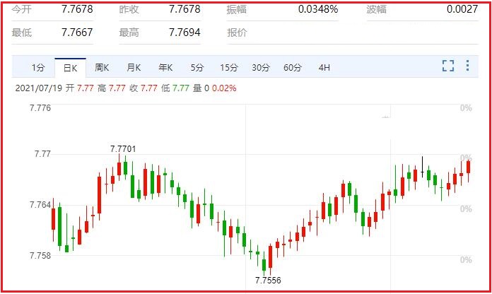 1.日线图上,美元对港元汇率收阳线,收盘价受MA5支撑,短期看涨。