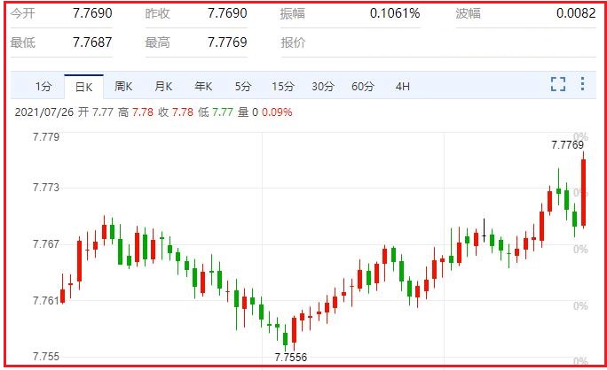 1.日线图上,美元对港元汇率收阳线,收盘价受MA5支撑,短期看涨。