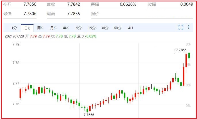 1.日线图上,美元对港元汇率收阴线,收盘价受MA5支撑,短期看跌。