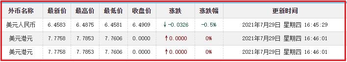 今日港元汇率最新汇价(2021年7月29日) 类别 最新价 开盘价 昨收价 港元对人民币汇率 0.8946 0.8968 0.8972 备注:以上港元汇率仅供参考,请以官方价格为准