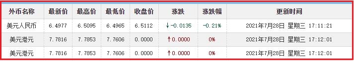 今日港元汇率最新汇价(2021年7月28日) 类别 最新价 开盘价 昨收价 港元对人民币汇率 0.8946 0.8968 0.