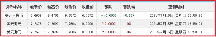 今日港元汇率最新汇价(2021年7月15日) 类别 最新价 开盘价 昨收价 港元对人民币汇率 0.8946 0.8968 0.8972 备注:以上港元汇率仅供参考,请以官方价格为准