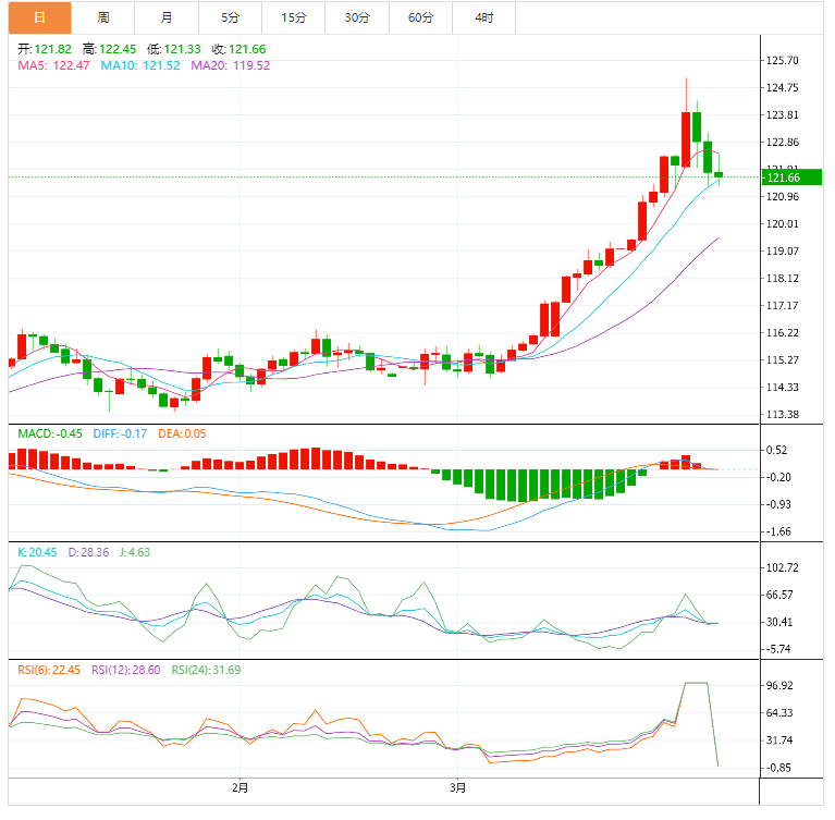 3月美元兑日元行情,美元兑日元从3月初的开盘价114.94至目前的121.73,美元兑日元3月整体下跌679点,其中在3月28日曾涨至最高点125.09。