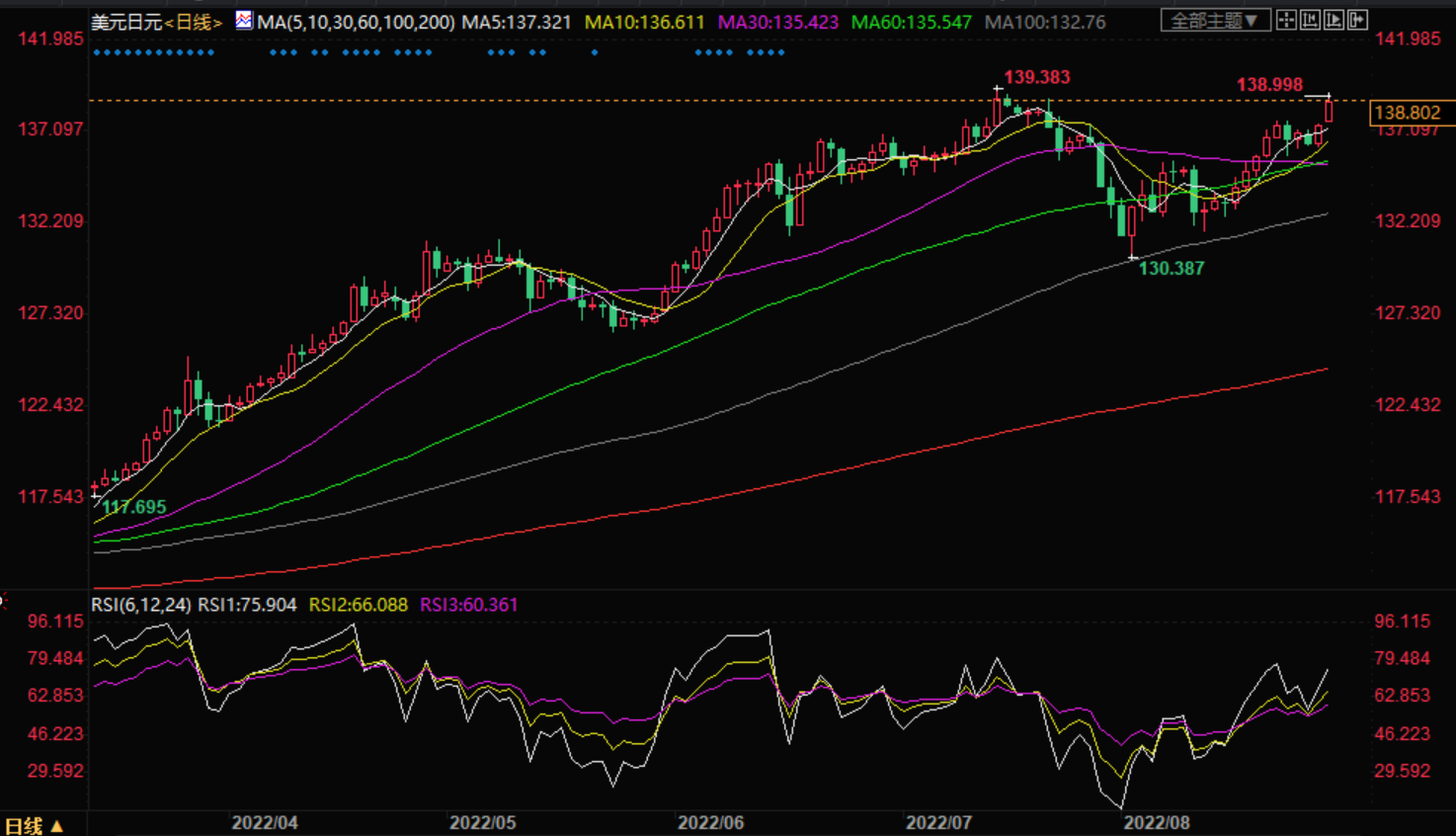 基本面上,美联储和日本央行两位央行领导人在8 月25 日至27 日举行的堪萨斯城联储杰克逊·霍尔研讨会上就经济和政策前景发表了讲话。将影响美元/日元的后市经济数据将包括本周晚些时候公布的美国ISM 商业调查和非农,周一无重要经济事件公布。从即将公布的经济数据来看,市场还将密切关注美联储对9 月加息押注的重新定价。本周初,市场押注美联储下个月加息75 个基点的概率为64%,高于周五的61%。