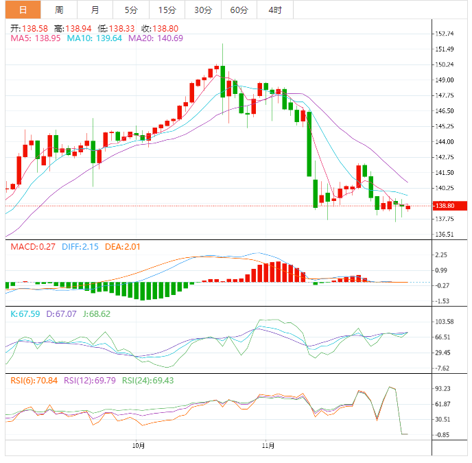 11月美元兑日元连续上涨之后下跌,日元加速贬值,美元兑日元从11月初的开盘价148.64,截至目前138.76,美元日元在11月15日触及月内低点138.04。