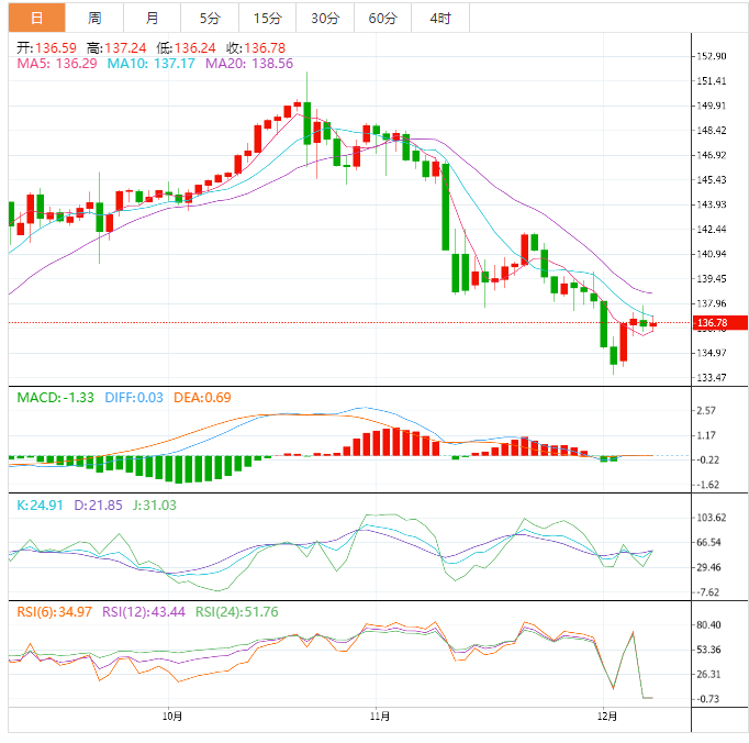基本面上,日本经济数据好于预期,美元/日元维持疲弱,交投于136.40附近。即便如此,美元/日元週三自一周高点回落后,仍总体处在震盪当中,原因可能是受开盘交易状况所致。日本第三季度国内生产总值终值好于最初预期,日本第三季度国内生产总值季率自-0.3%升至-0.2%,国内生产总值年率录得-0.8%,期值-1.1%,前值-1.2%。另外,日内经济数据清淡,中国放鬆新冠疫情清零政策,且美债收益率暂时处在震盪当中,似乎对美元/日元空头构成挑战