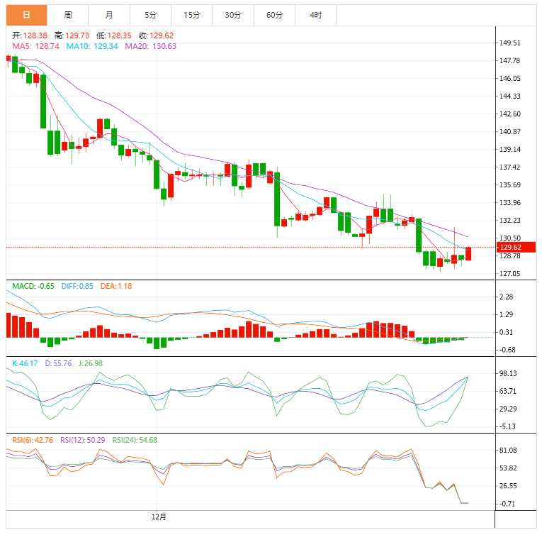 技术面上,美元兑日元积极波动,测试关键阻力位128.90,同时随机到达超买区域,而EMA50对价格形成了负压,因此,有可能恢复主要的看空趋势,目标位127.10和126.35是下一个主要位置。因此,除非突破128.90并保持日收盘价高于该水平,否则今天将出现看跌偏见。