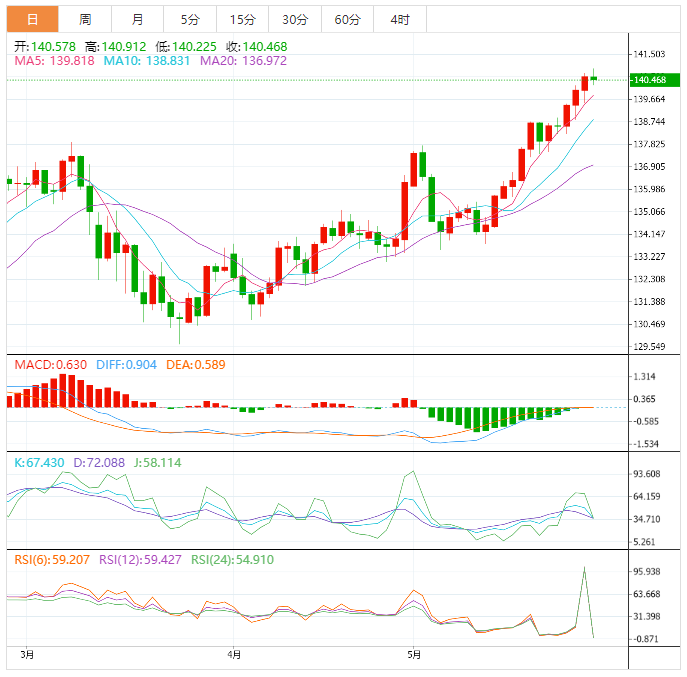 总的来说,建议在接下来的一段时间内继续整体看涨趋势,下一个目标位于141.00,而突破139.30代表负面因素,将推动价格在日内开始修正看跌波。