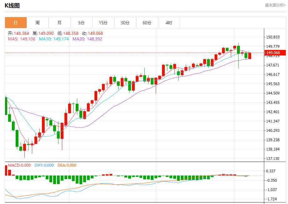 今天的预期交易区间在147.70支撑和149.10阻力之间
