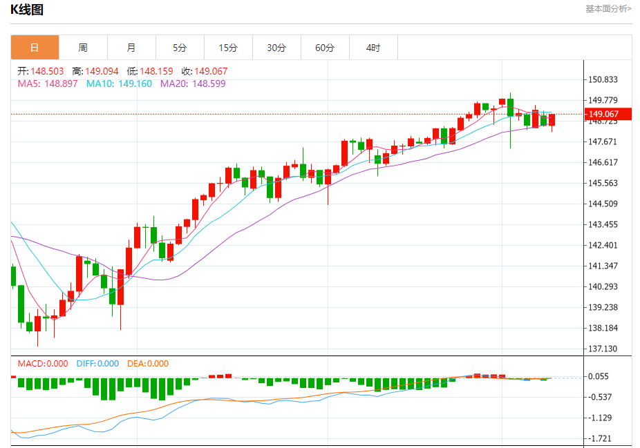 周二纽盘,美元兑日元交投于149.076,涨幅为0.38%。