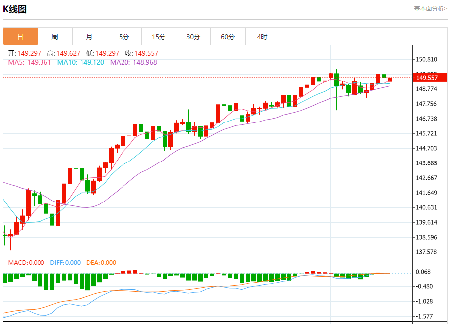今日周一,截止目前美元兑日元报149.564,下跌0.02%。