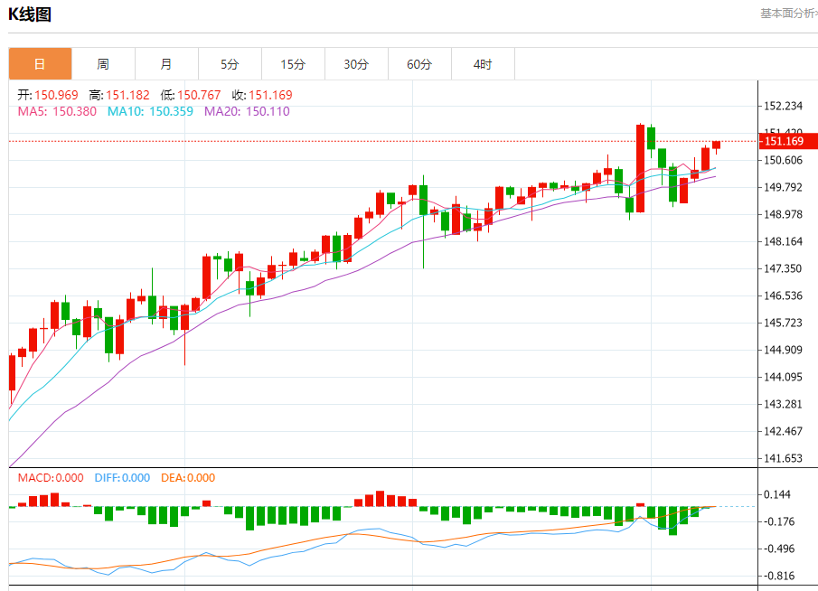 今日周四,截止目前美元兑日元报151.179,上涨0.13%。