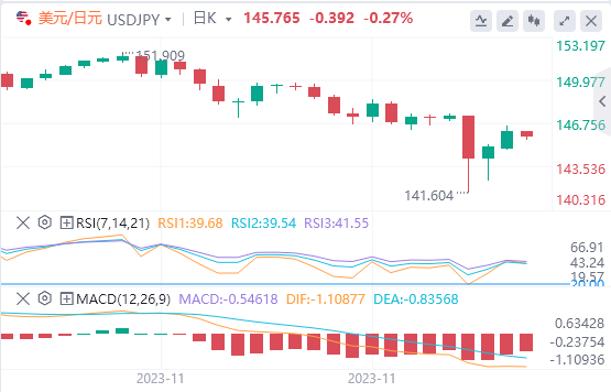 美元/日元周一上涨0.81%。继周五上涨0.61%后,美元/日元收盘报146.145点。美元/日元跌至144.811的低点,然后升至周一的146.589的盘中高点。