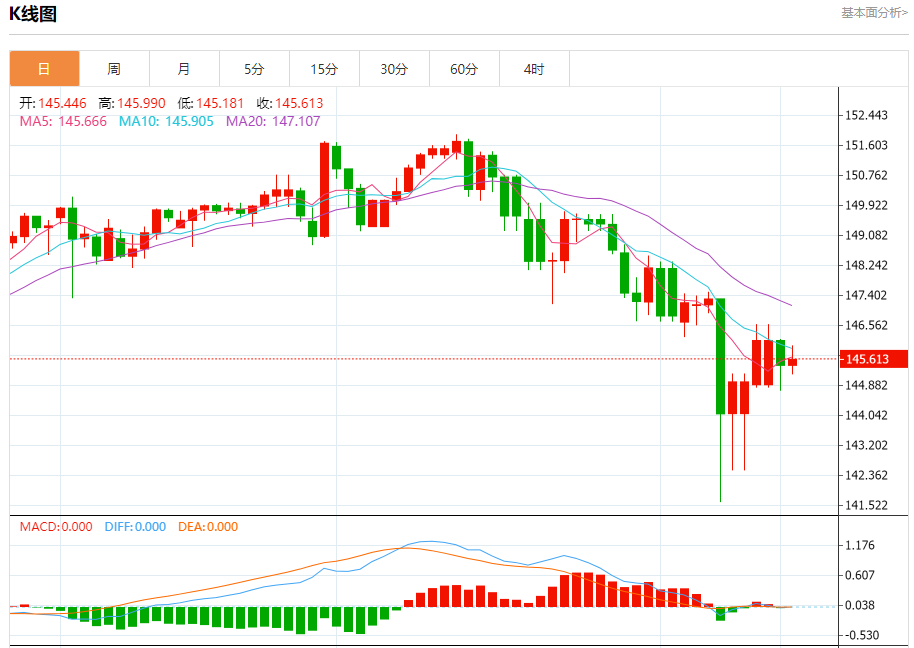 今日周三,截止目前美元兑日元报145.629,上涨0.11%。