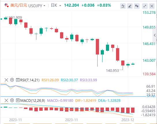 美元/日元周五上涨0.21%。在周四下跌0.73%后,美元/日元收盘报142.134点。美元/日元升至142.466的高点,随后跌至141.427的低点。