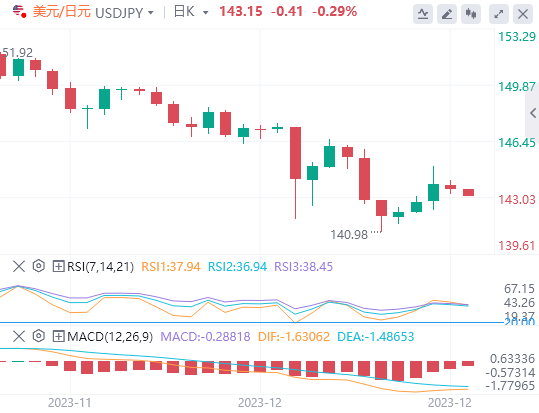 美元/日元周三下跌0.19%。在周二上涨0.75%后,美元/日元周三收盘报143.599点。美元/日元在跌至143.261的低点之前,曾升至144.098的高点。