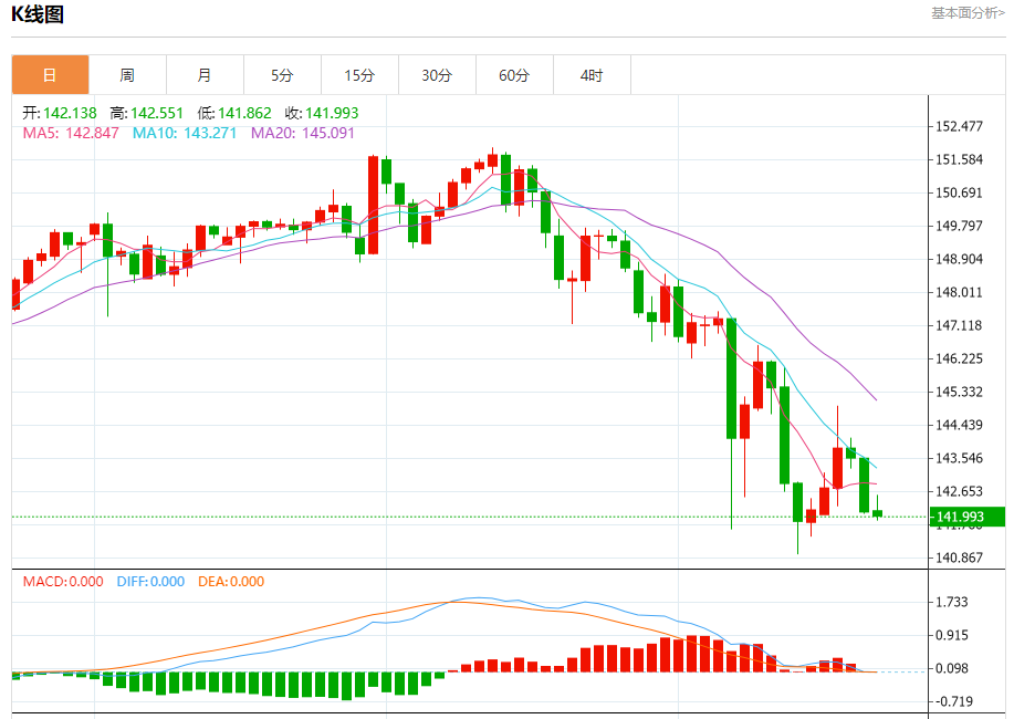 今日周五,截止目前美元兑日元报142.018,下跌0.07%。