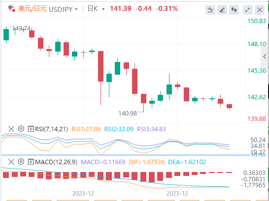 美元/日元周三下跌0.41%。美元/日元扭转了周二0.08%的涨幅,收盘报141.814点。美元/日元升至142.845的高点,随后跌至141.542的低点。