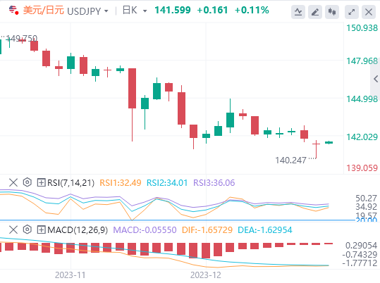 美元/日元周四下跌0.31%。在周三下跌0.41%后,美元/日元收盘报141.368点。美元/日元升至142.822的高点,随后跌至140.249的低点。