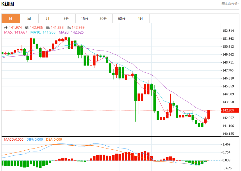 周三纽盘,美元兑日元交投于142.985,涨幅为0.70%。