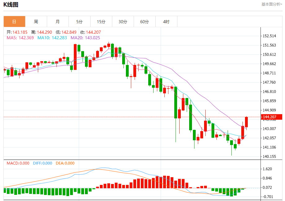今日周四,截止目前美元兑日元报144.228,上涨0.65%。